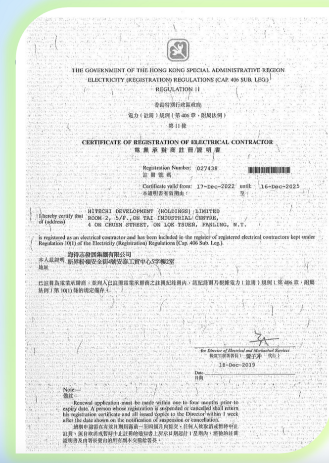 政府註冊牌照- 公司電業承辦商註冊證明書